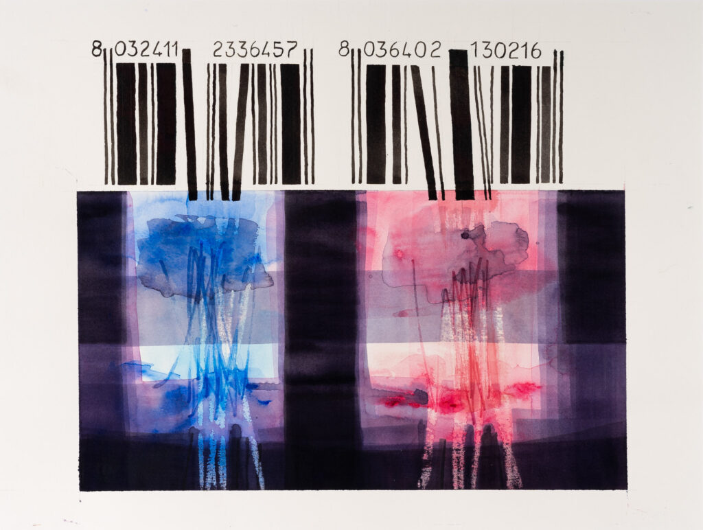 Alle due figure organiche inserite nel riquadro strutturato a fasce si contrappongono due barcode disposti a guardia dei loro movimenti. Forme di controllo permanenti, operate dal sistema nei confronti delle componenti vitali della societa