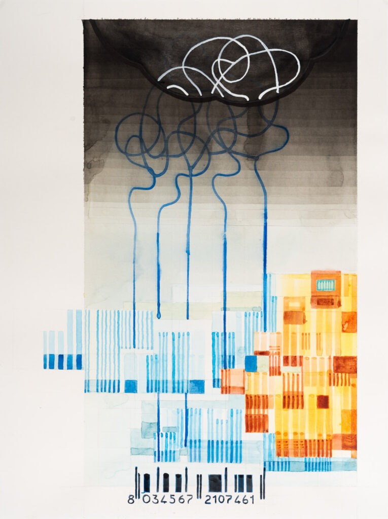 Lo skyline di un frammento metropolitano rivela, attraverso la sua costruzione per piani, l’origine determinata dal barcode che fuori dal contesto urbano rivela la sua natura caotica e competitiva.